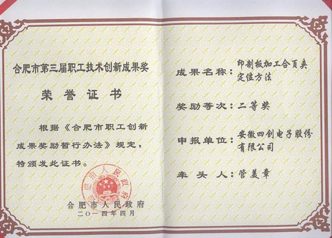 五一劳动节前夕,合肥市政府和合肥市总工会传来喜讯,在合肥市第三届职工技术创新成果奖评选中,suncitygroup太阳集团公司的《印制板加工合页夹定位方法》项目获职工技术创新成果二等奖;同时,管美章同志获“合肥市金牌职工”荣誉称号。