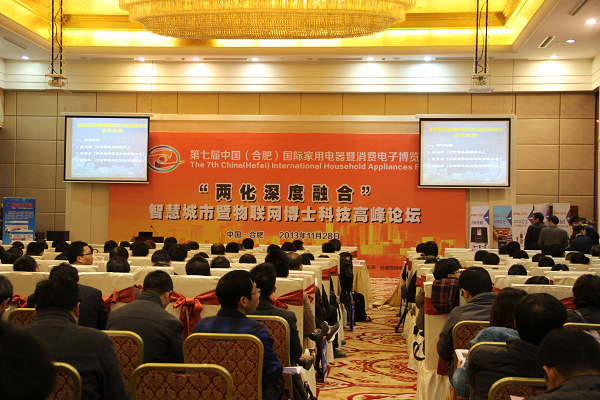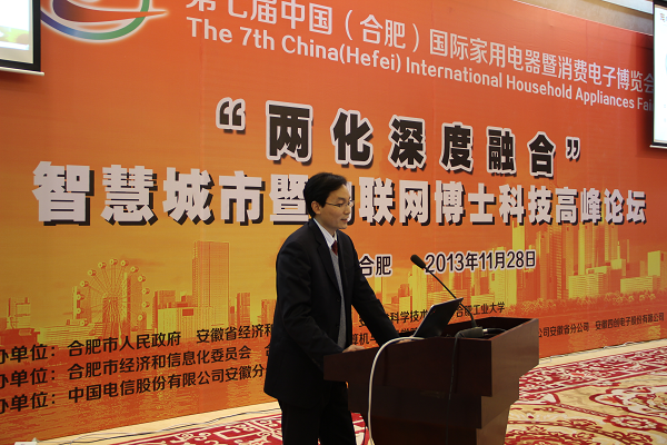 11月28日,由安徽省人民政府、工业和信息化部、中国国际贸易促进委员会主办,安徽省经信委、合肥市人民政府、安徽省信息化协会承办的《两化深度融合之智慧城市暨物联网博士科技高峰论坛》在合肥市稻香楼宾馆隆重举行。我公司连同中国电信安徽分公司、中国移动安徽有限公司、中国联通安徽分公司作为协办单位参加了本次论坛。公司副总经理王佐成代表公司出席会议并做了演讲。
