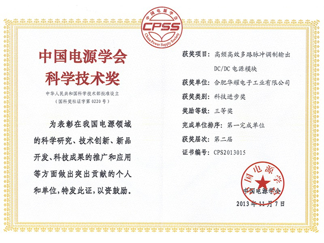 中国电源学会是国家一级学会,也是目前国内电源行业唯一的全国性行业组织。中国电源学会科技进步奖是由国家批准,在全国范围内评选的科技奖励。2013年全国仅13个电源项目获此奖项。