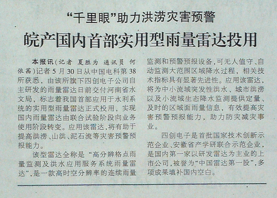 《安徽日报》头版报道我司自主研发的国内首部实用型雨量雷达交付客户