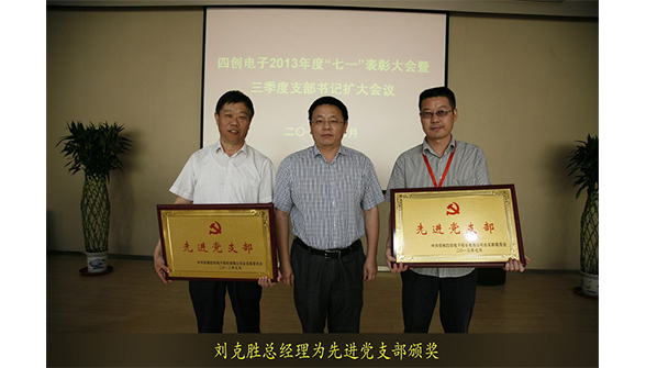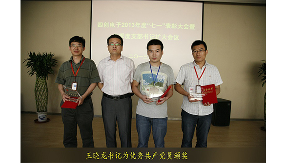 会议首先由综合办公室主任李思明宣读了《关于表彰公司2012-2013年度先进党支部、优秀共产党员的决定》,并举行了简短的颁奖仪式。刘克胜总经理为安防事业部、产品事业部联合党支部,华耀电子党支部颁发了“先进党支部”荣誉奖牌;王晓龙书记为陈少应、何世磊、张晓飞三位同志颁发了“优秀共产党员”奖杯及证书。刘克胜总经理向获表彰的单位及个人表示祝贺,感谢他们为四创发展所做出的贡献,号召全体党员员工向先进学习,为公司发展做出更大成绩。